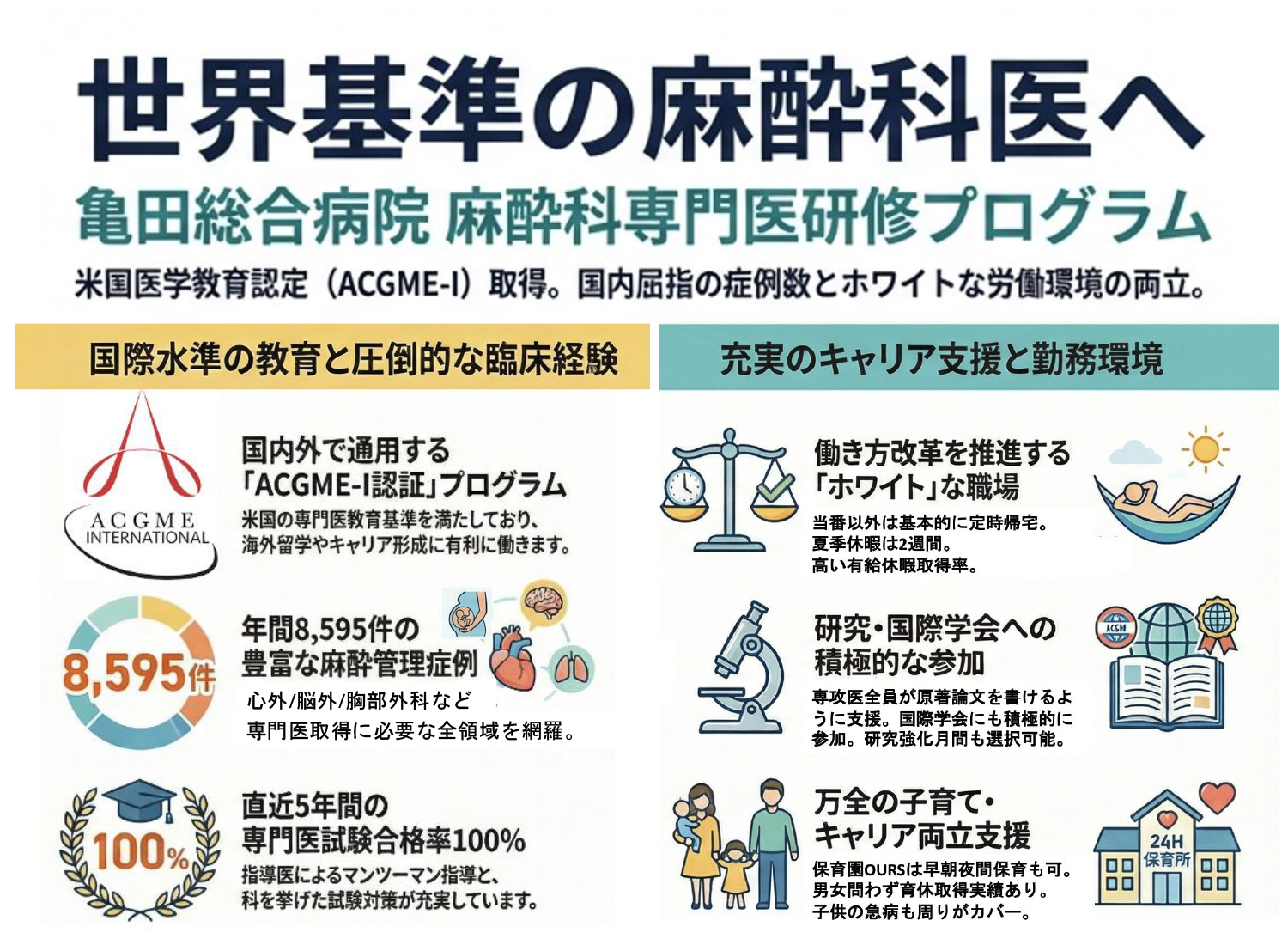 手術症例数が多いことから、忙しすぎるように感じるかもしれませんが、経験豊富な麻酔科専従特定看護師や臨床工学技士が補助してくれるため、2024年度より本格化された働き方改革にも対応したホワイトな労働環境で、有給休暇取得率も非常に高いです (夏季休暇は2週間取得可能)。当科では時間外の麻酔はオンコール(手術がなくなれば帰宅可)と居残り(時間外手術が残り一列になるまでの勤務)で運営するようにしております。オンコール/居残り以外は定時に帰宅できます。専攻医は月4〜6回のオンコール、指導医はオンコールと居残り併せて月3〜6回(当番免除者は除く)担当していただいております。また、子育てに関しては男女関わらず育休取得実績があります。亀田病院は職員のための早朝/夜間預かり可能な認定こども園(OURSアワーズ)も敷設しており、保育所探しに困ることはありません。フレキシブルな対応が可能なため、急な保育時間の延長や早朝保育にも対応しています。急な子供の発熱などでも大人数を活かしてカバーができるため休みが取りやすいです。子育て中の医師にとってもキャリアアップしやすい環境です。